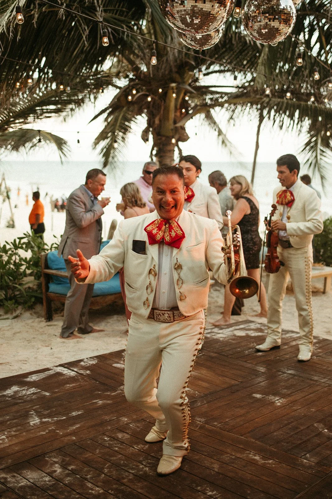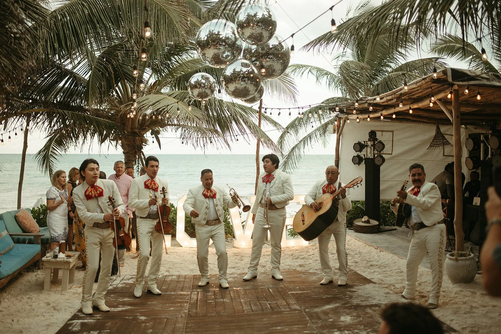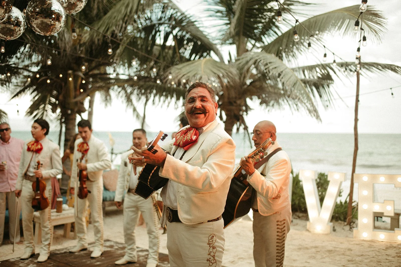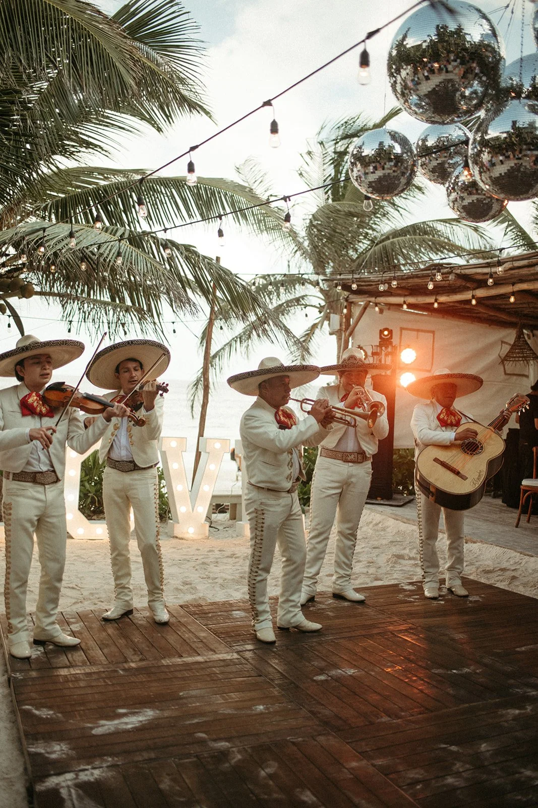 Caroline and Michael's wedding was a celebration like no other, filled with vibrant energy and an eclectic mix of fun elements that left their guests in awe. The couple went all out in creating a lively atmosphere, adorning the venue with shimmering disco balls that illuminated the dance floor with a kaleidoscope of colors. The sounds of a live mariachi band echoed through the air, adding a touch of traditional Mexican charm to the festivities. As the night progressed, guests couldn't resist joining in on the excitement as tequila shots were passed around, creating an exuberant spirit of camaraderie and joy. The combination of the disco balls, the lively music, and the tequila shots ensured that the dance floor was never empty, and everyone danced the night away with pure elation. Caroline and Michael's wedding was an extraordinary affair that perfectly embodied their love for each other and their desire to share the joyous moments of their special day with their cherished guests.