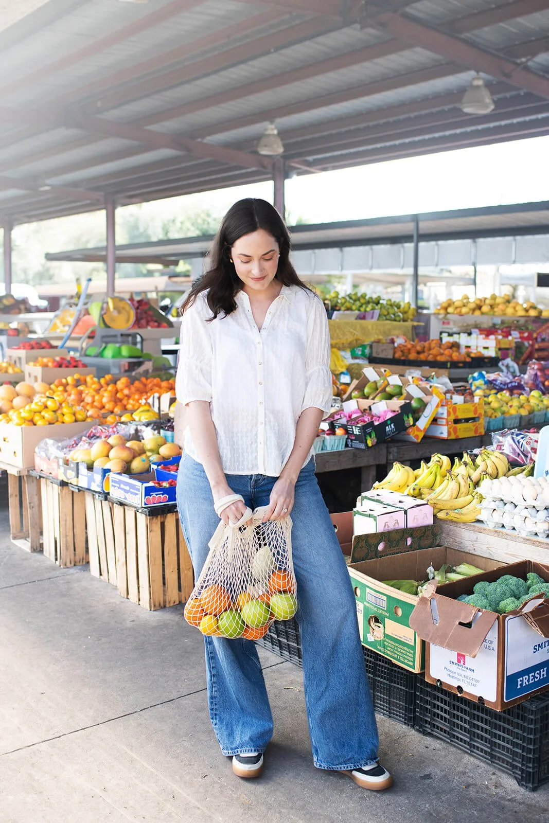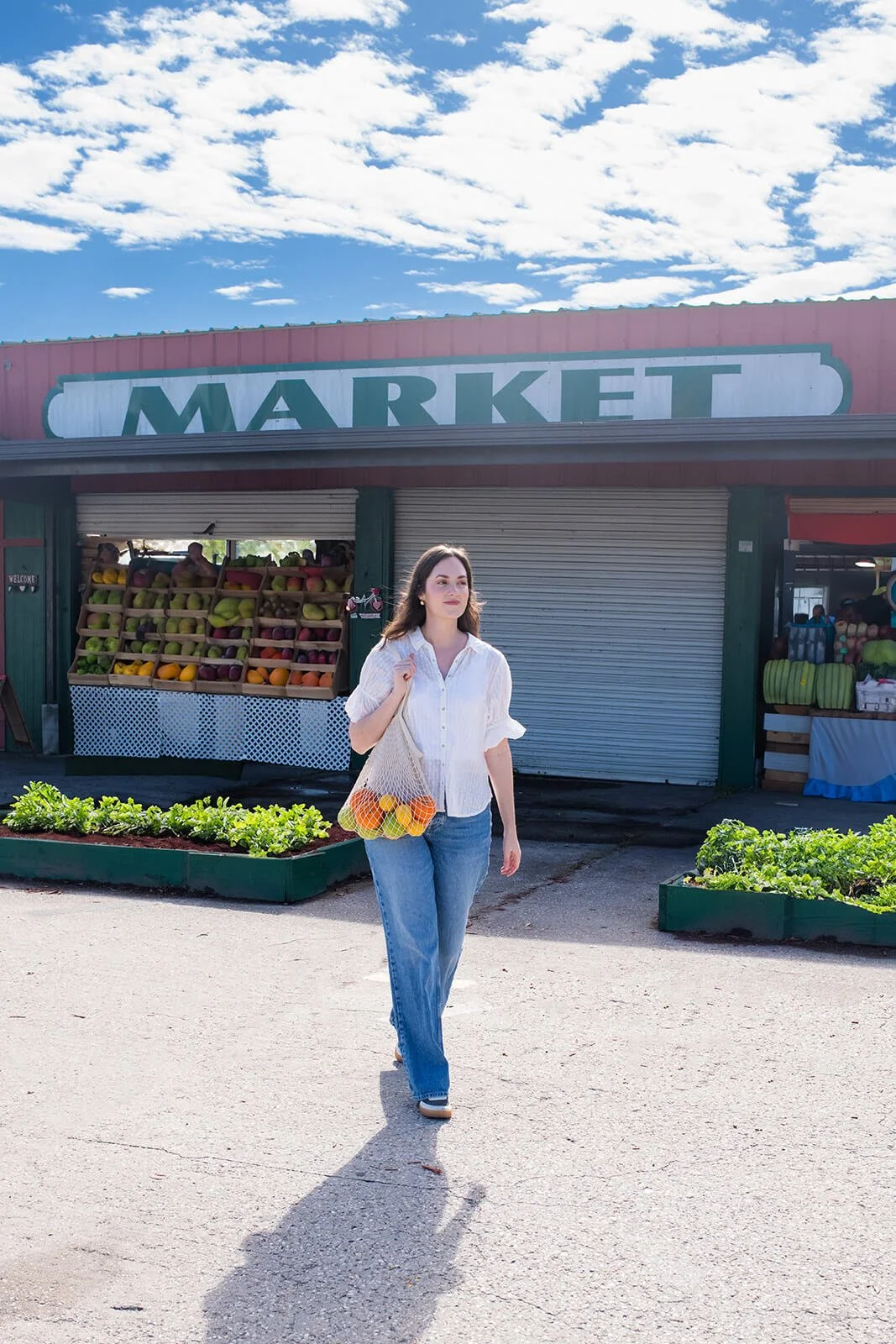 We started at the iconic Jacksonville Farmers Market. For a nutrition professional like Dietician Kelsey, this location visually communicates her work before she says a word. The vibrant produce, natural textures, and community energy align perfectly with her brand. As a Jacksonville branding photographer, I often guide clients toward locations that support their message. In this case, the farmers market provided: